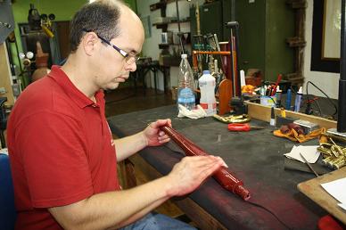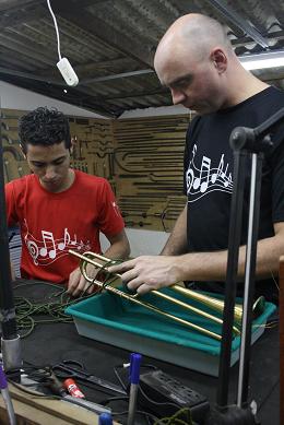 Thiago testendo o seu instrumento após restauração.