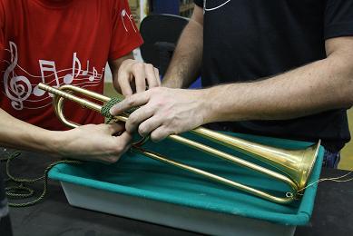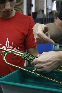 O aprendiz e o luthier junto colocando o novo cordamento no trompete barroco.